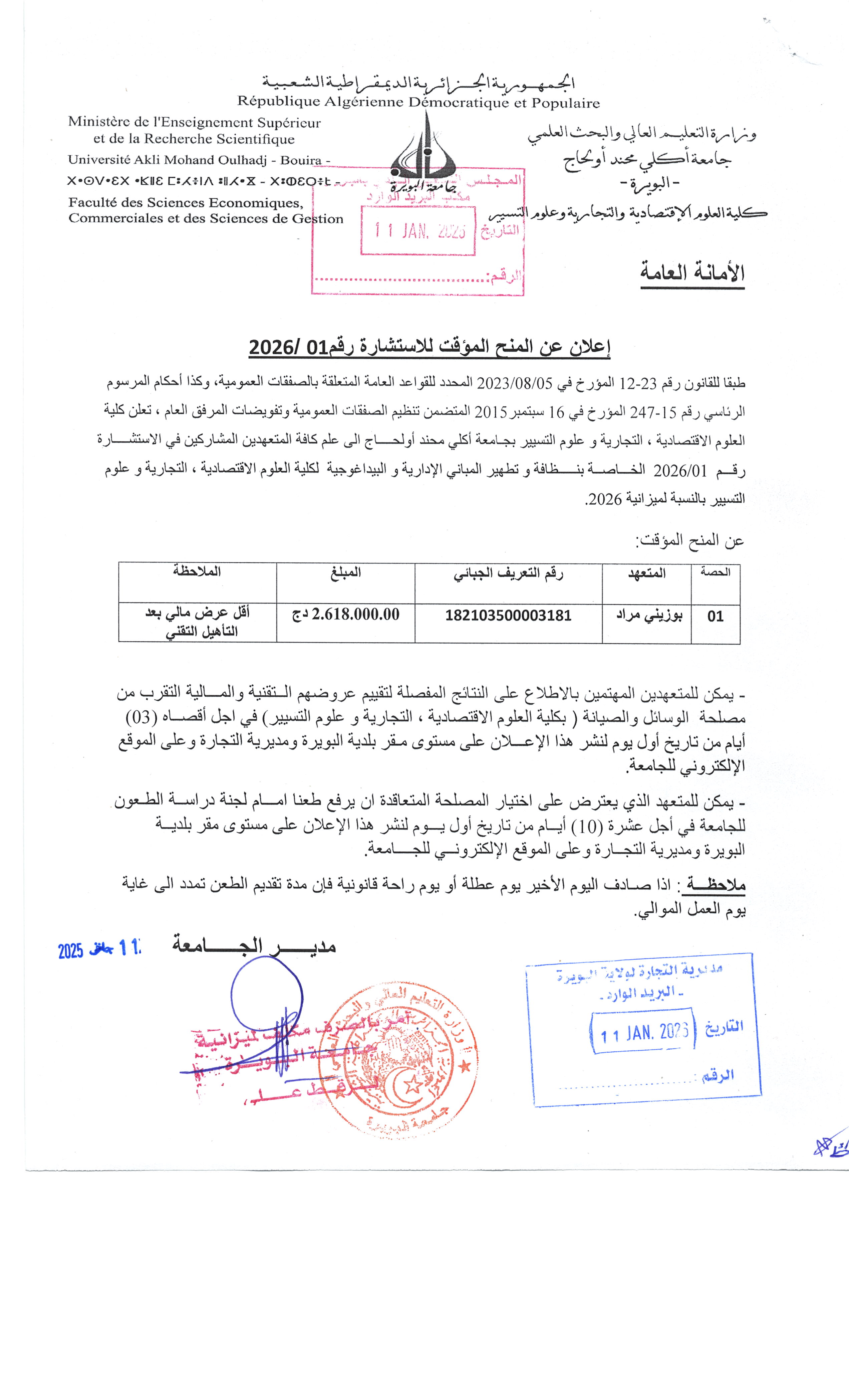 Avis de consultation relatif à l’opération de nettoyage des blocs pédagogiques et administratifs au niveau de la Faculté des Sciences Economiques, Commerciales et des Sciences de Gestion ….. cliquez pour plus de détails