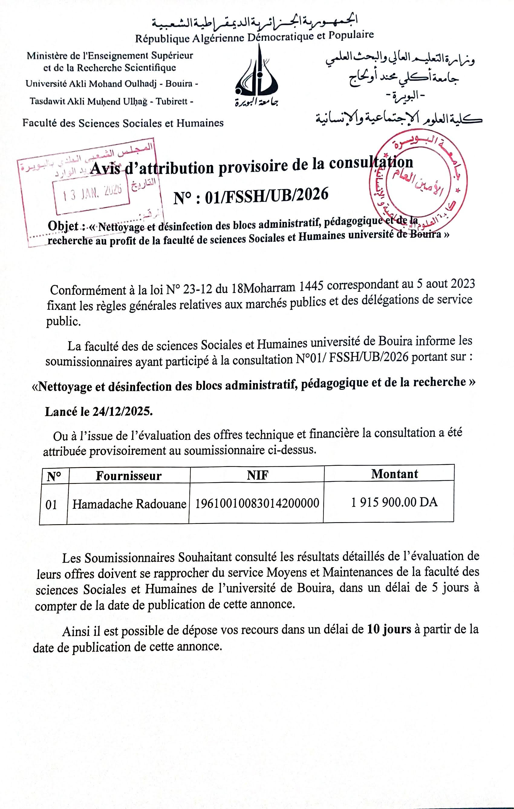 Avis de consultation relatif à l’opération de nettoyage des blocs pédagogiques et administratifs au niveau de la Faculté des Sciences Humaines et Sociales ….. cliquez pour plus de détails