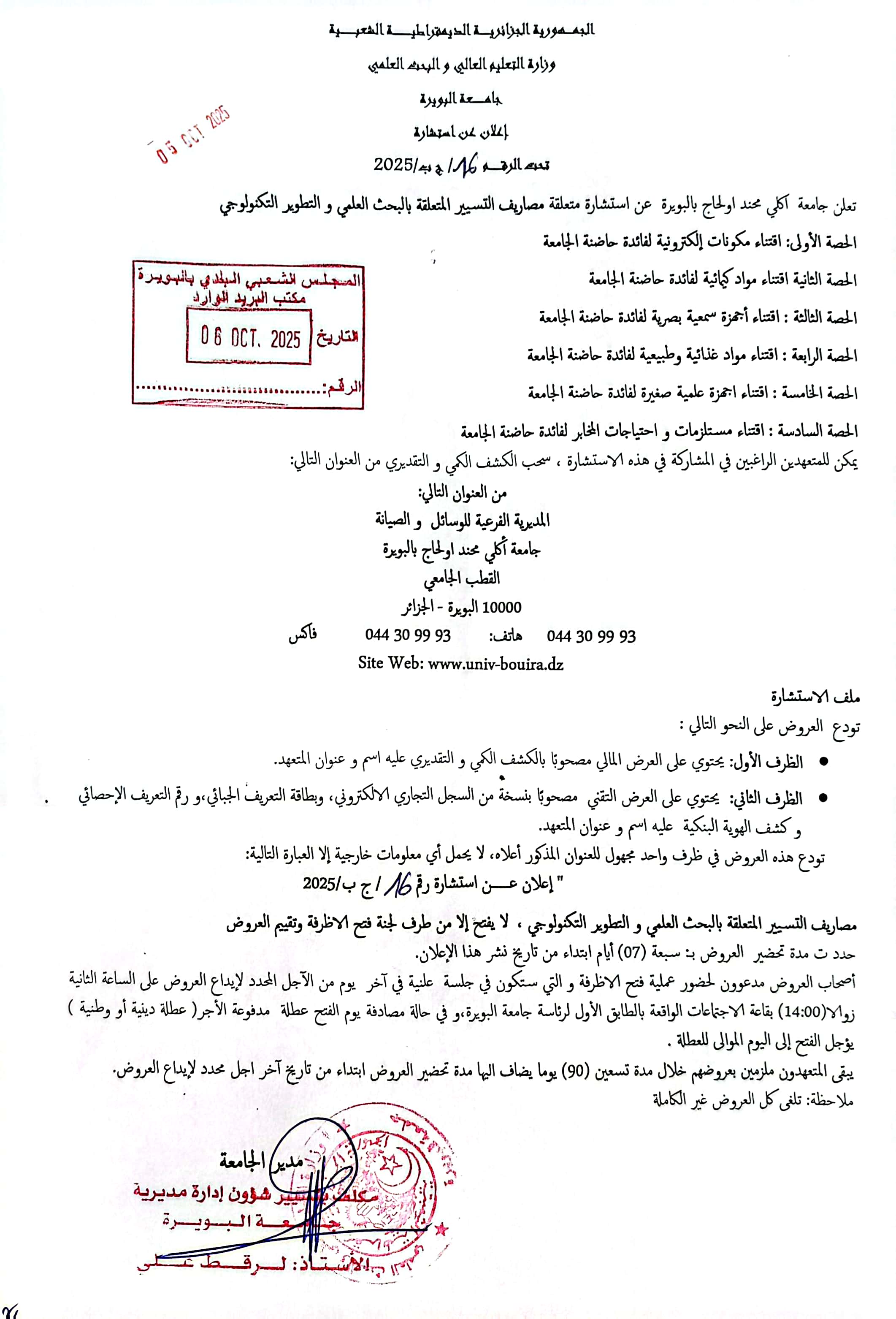Avis de Consultaion – Rectorat اقتناء مكونات الكترونية لفائدة حاضنة الجامعة .. طالع اكثر اقتناء الأثاث لفائدة حاضنة الجامعة .. طالع اكثر