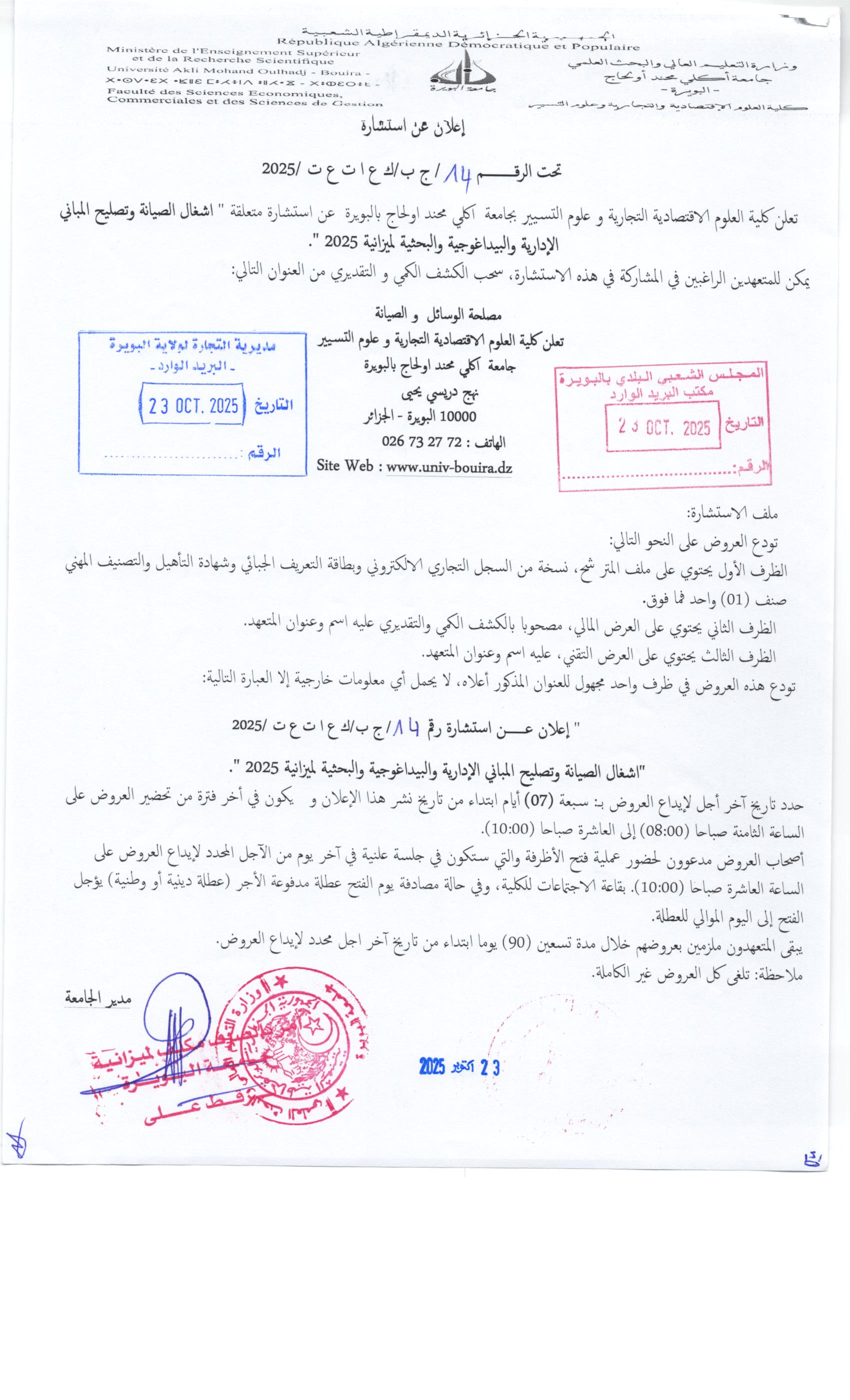 Avis de consultation – Faculté des sciencces economiques اشغال الصيانة للمباني الادارية والبحثية … طالع اكثر اقتناء عتاد واثاث للبيداغوجيا … طالع اكثر