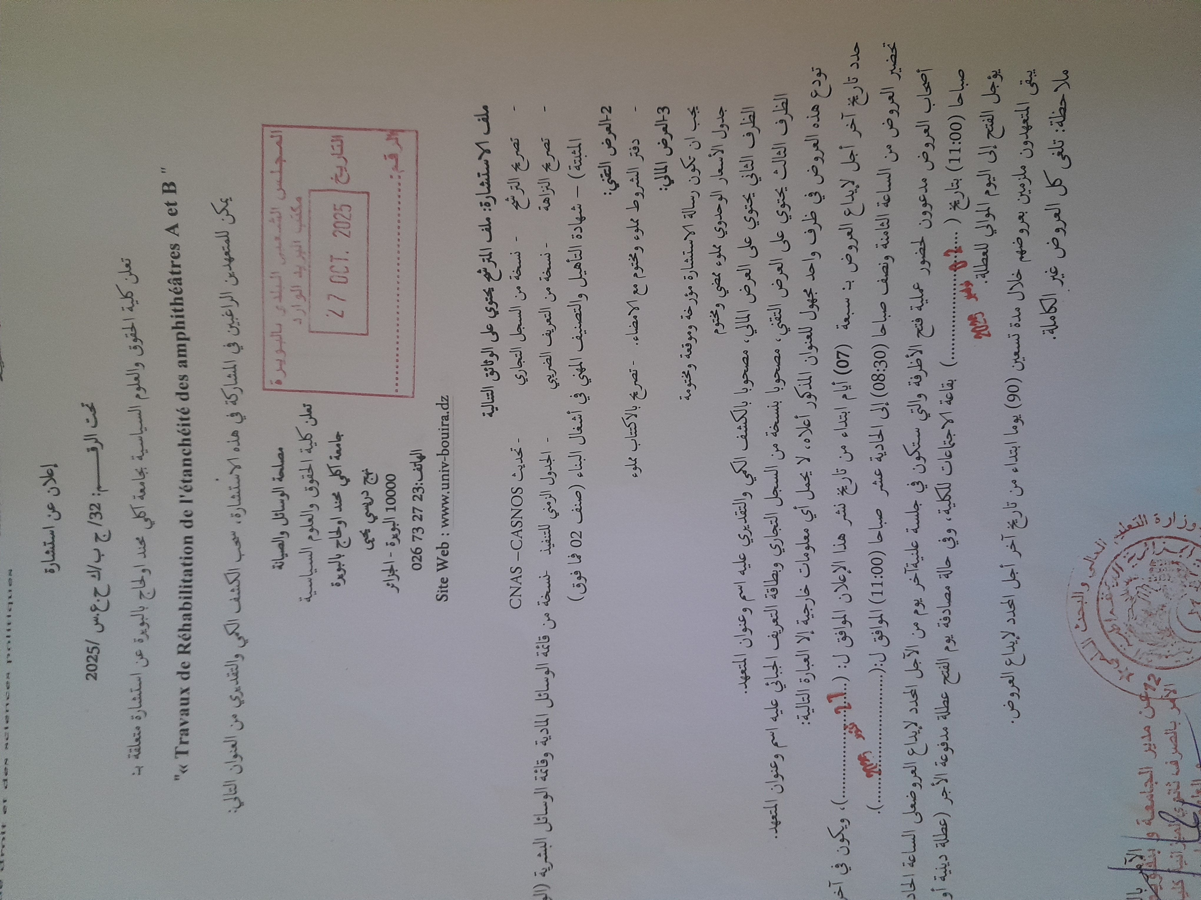 Avis de Consultation – Faculté de droit et sciences politiques Travaux de rehabilitation de l’étanchieté … en savoir plus