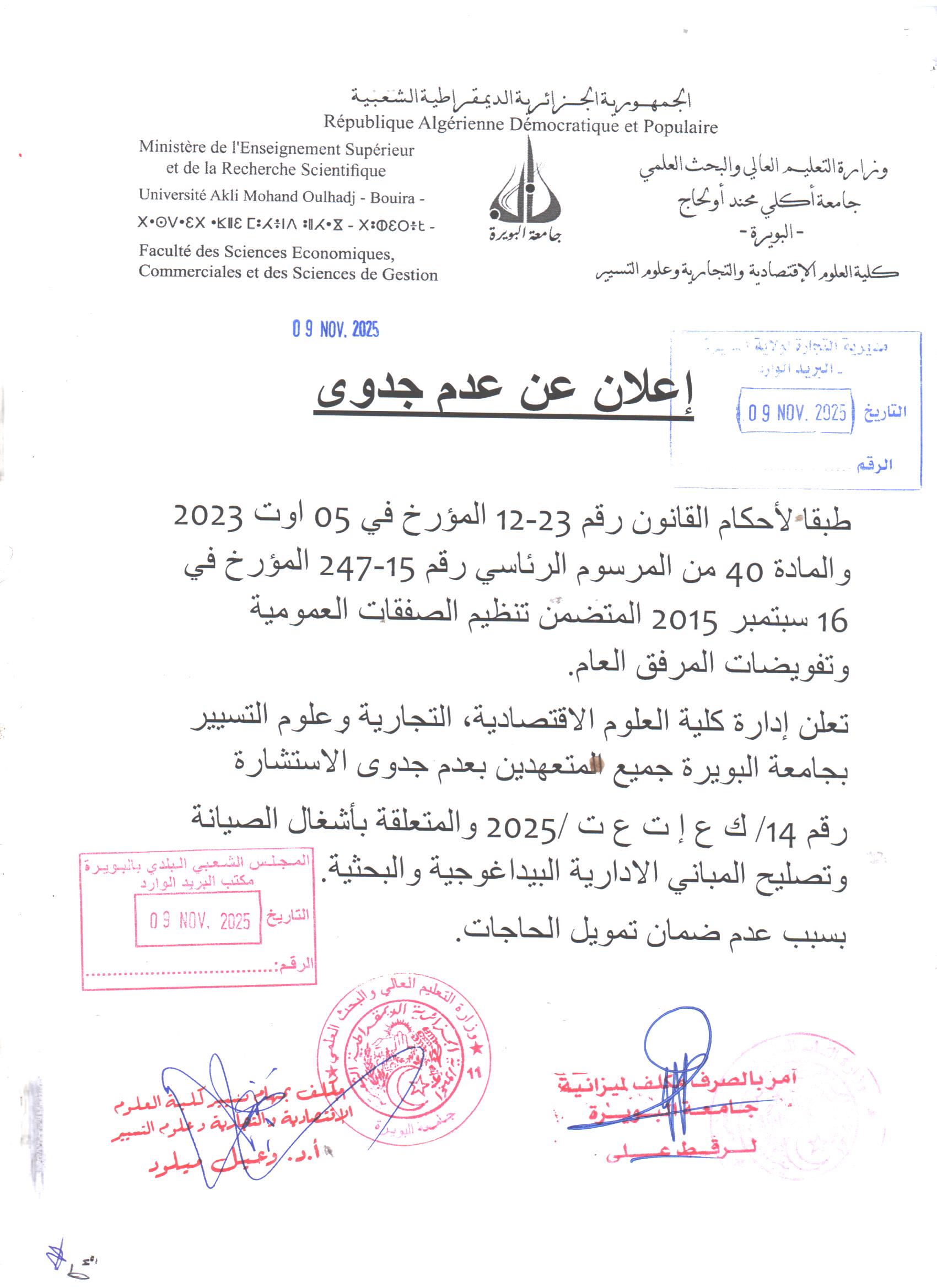 Faculté des Sciences Economiques – Avis d’infructuosité de la consultation N°14/2025 Avis d’infructuosité de la consultation N°14/2025 portant sur des travaux d’aménagement … plus de détails