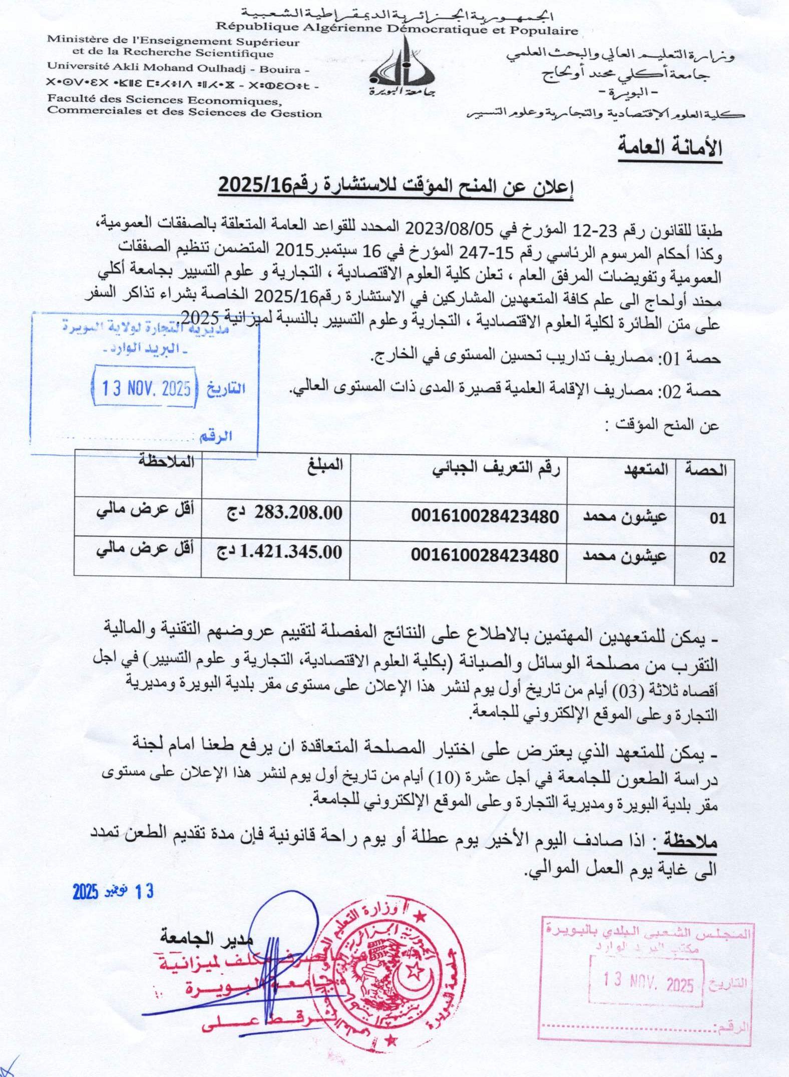Avis d’attribution provisoire de la consultation relative à l’acquisition de titres de transport par voie aérienne constituée de deux lots et lancée par la faculté des Sciences Economiques ….. Plus de détails