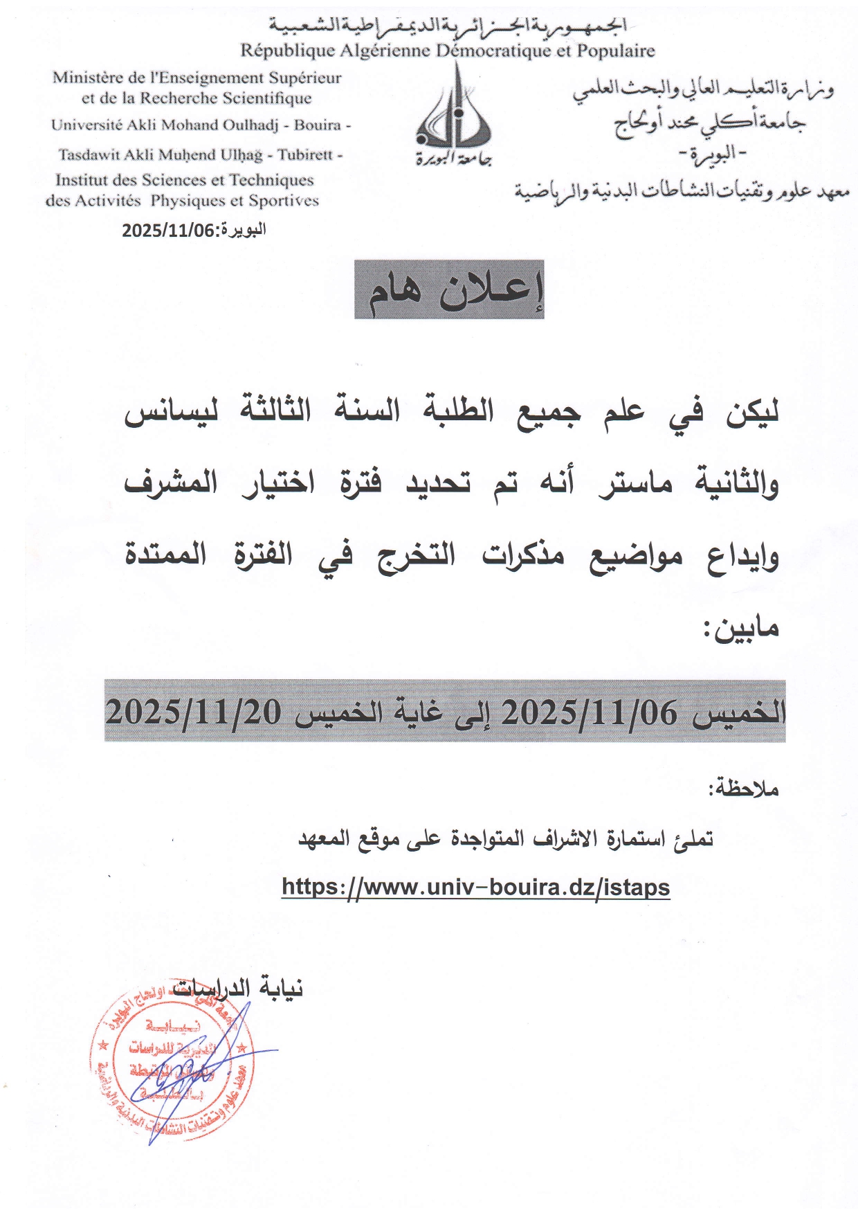 الاحداث المستجدات بطاقة إشراف مذكرة التخرج 09/11/202510/11/2025 ملئ البطاقة الخاصة بالليسانس من هنا … ملئ البطاقة الخاصة بالماسترمن هنا …